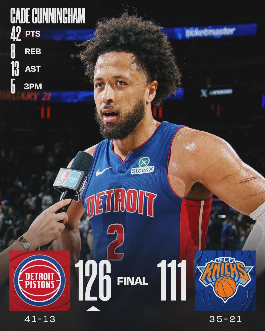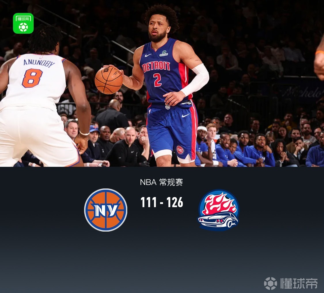活塞126-111三杀尼克斯,坎宁安42+8+13,布伦森33+6+7