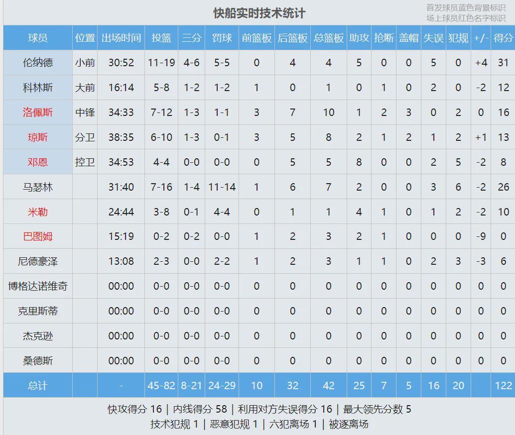 全场结束,湖人125-122险胜快船。东契奇38分6板11助3断、里夫斯29分6板2助2断,詹姆斯和艾顿各得13分。伦纳德31分4板5助、马瑟林26分7板2助。泰伦卢赛后不满判罚:“湖人球员很优秀了,还要骗犯规!这种吹罚真的很难!”