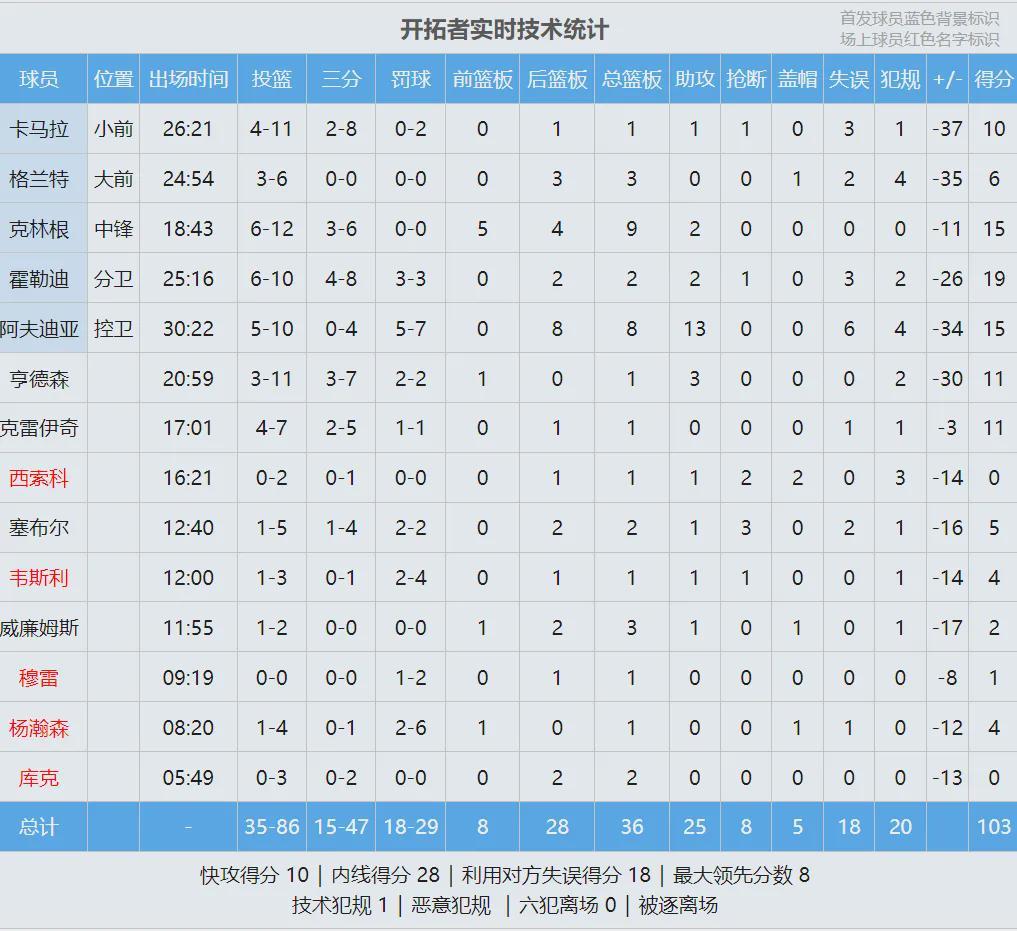此役阿夫迪亚投篮10中5,三分4中0,罚球7中5,得到15分8篮板13助攻6失误,正负值-30。约基奇打了29分钟,投篮15中10,三分4中3,罚球11中9,狂砍32分9篮板7助攻4抢断,正负值+40。其中正负值追平约老师生涯纪录!