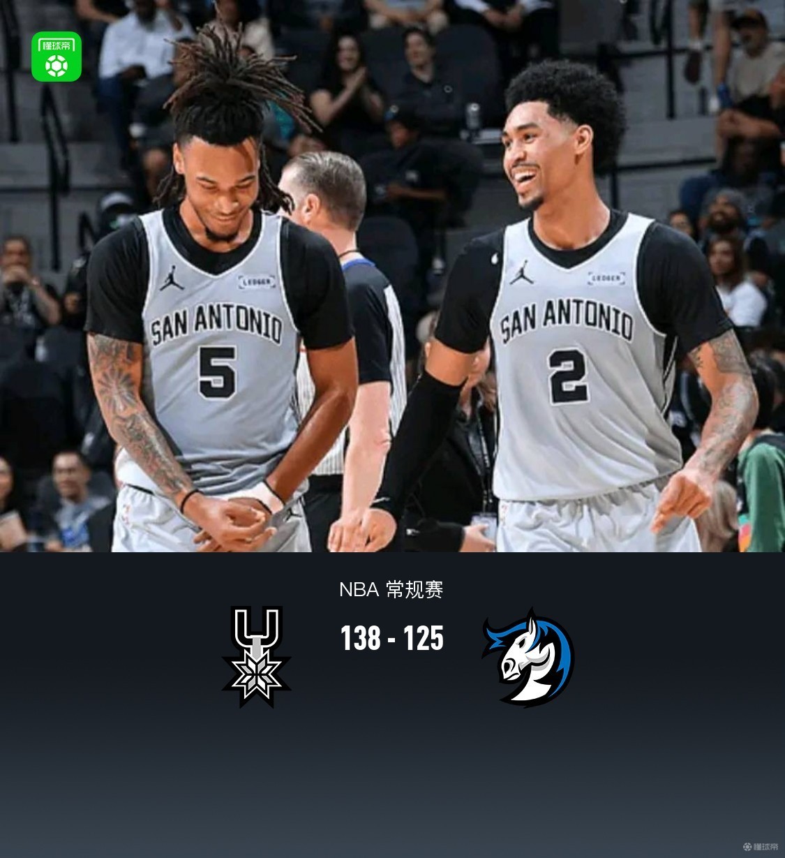 第四节,双方再度展开对攻局面,三分持续回应,马刺维持20分上下领先,比赛最后4分钟双方彻底换下主力进入练兵时间,最终马刺138-125战胜独行侠。