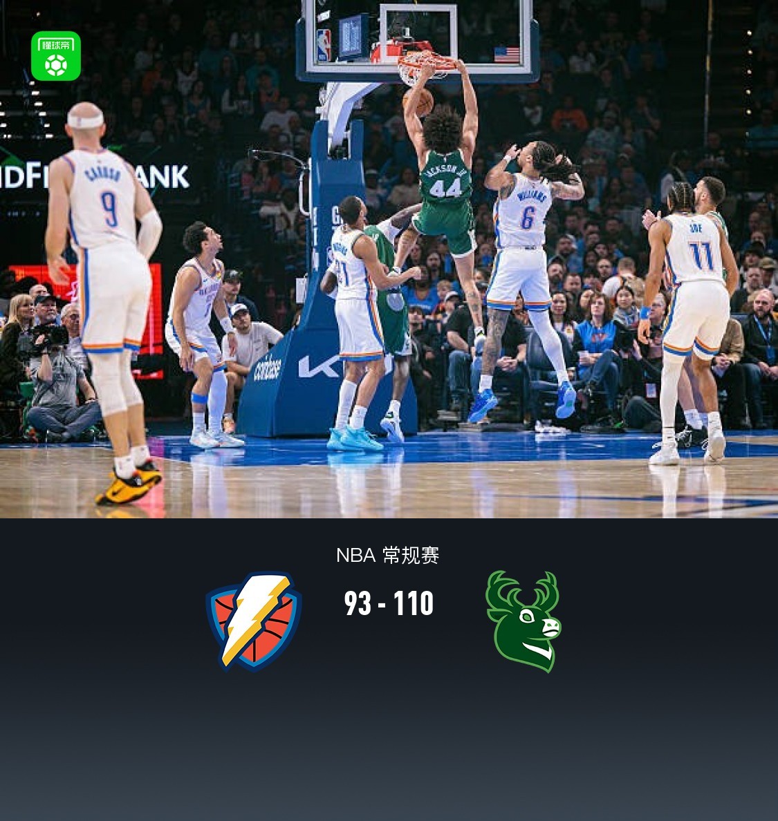 雄鹿110-93大胜雷霆,迪昂19+11+6+4帽弑旧主,霍姆格伦16+13