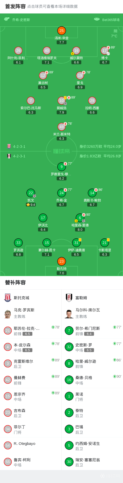 第19分钟,裴峻浩率先得分,斯托克城1-0领先富勒姆
