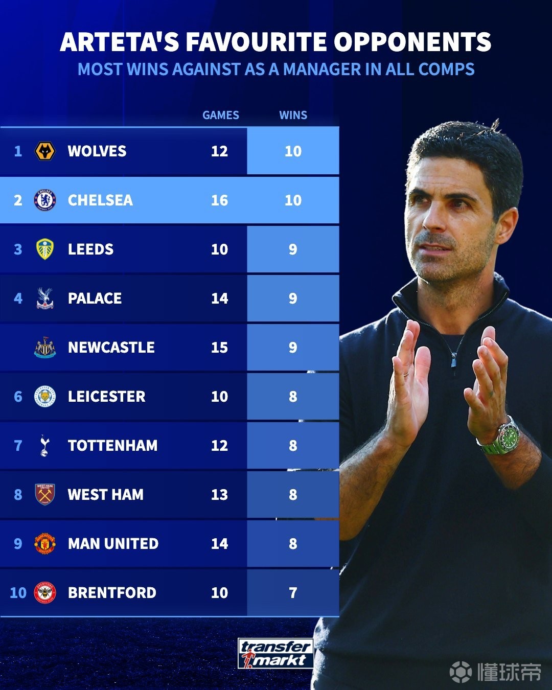 喜欢的对手,切尔西是阿尔特塔赢球最多的球队,16场取得10胜