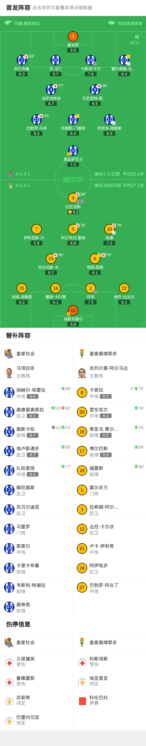 皇家社会3-3皇家奥维耶多,比尼亚斯首开记录,拜利救主