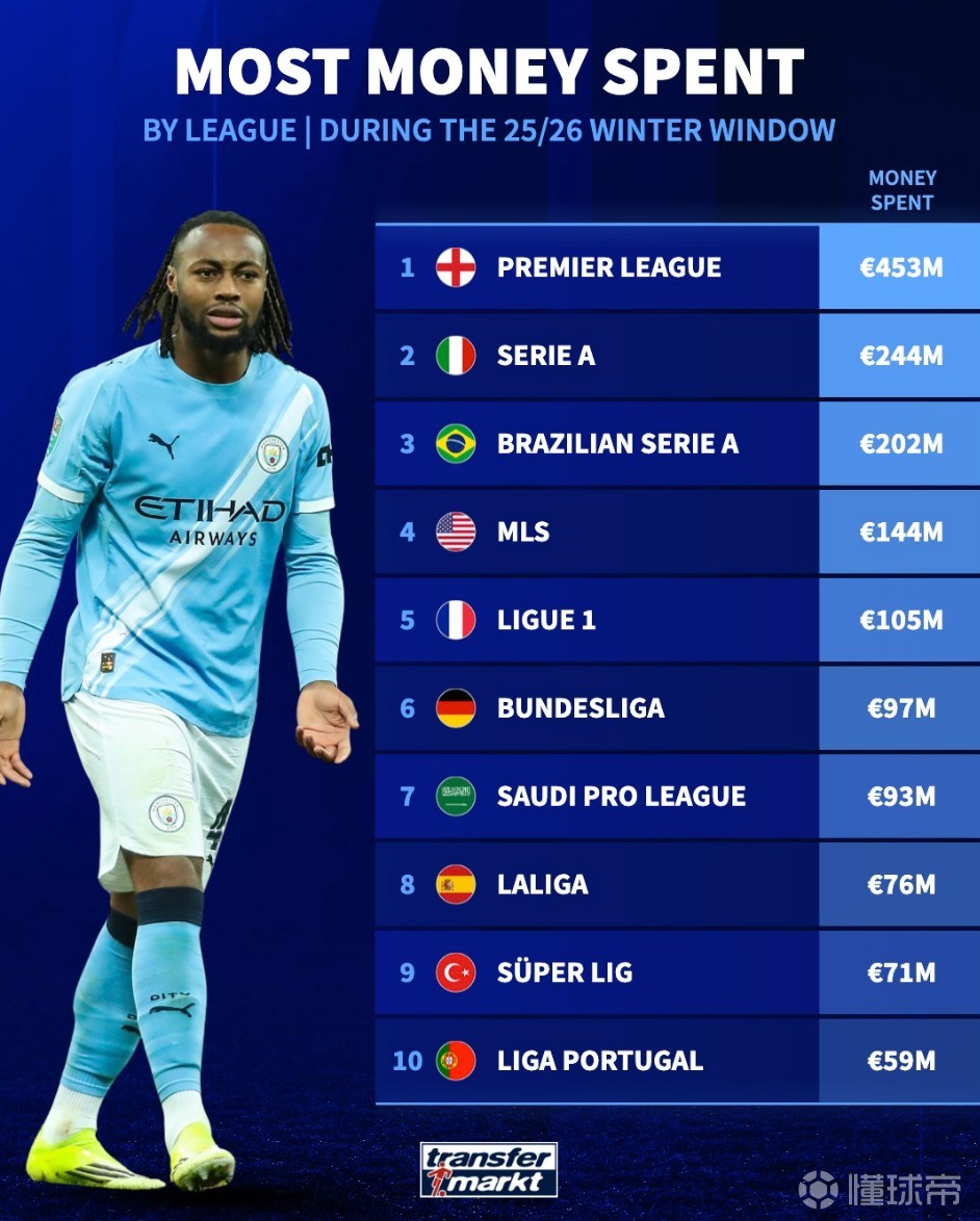 德转列2026年冬窗联赛支出榜:英超4.53亿欧断档第1,意甲第2