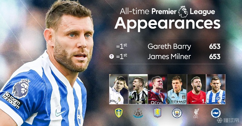 英超第26轮,布莱顿客场对阵维拉,上半场40岁的米尔纳替补登场,迎来英超生涯第653次出场,追平英超历史出场纪录。