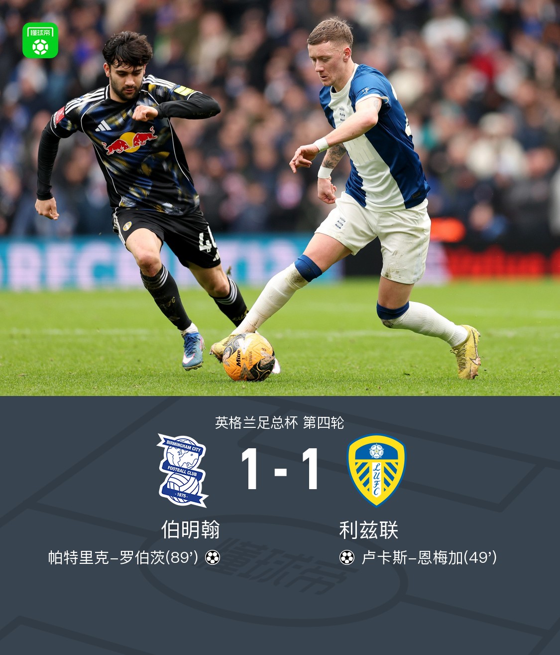 90分钟:利兹联1-1伯明翰,卢卡斯-恩梅加破门,罗伯茨绝平