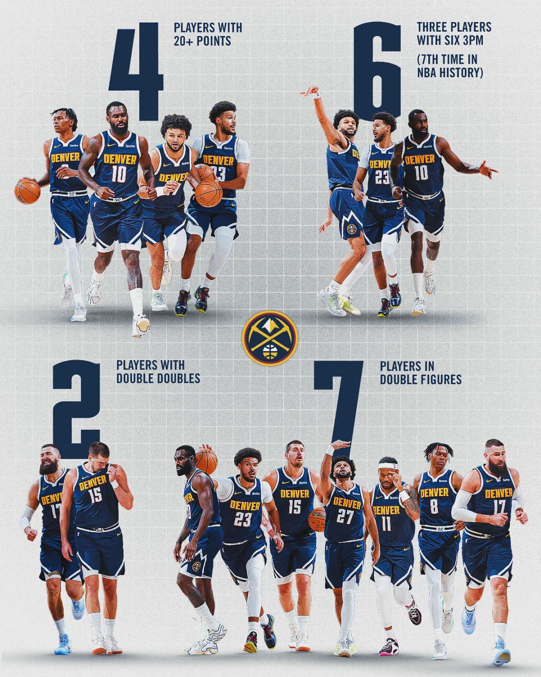 掘金两个首发缺阵:阿隆-戈登和佩顿-沃特森都没打。本赛季掘金场均120.9分,高居联盟第一;进攻效率123.8,同样是联盟第一;投篮命中率49.6%,联盟第二;三分命中率39.6%,联盟第一;场均罚球命中数21.1,联盟第二。