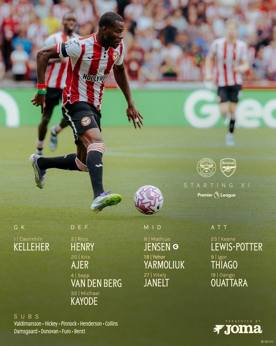 布伦特福德首发:1-凯莱赫、33-卡约德、20-阿耶、4-范登贝尔赫、3-亨利、27-雅内尔特、18-亚尔莫柳克、8-延森、23-波特、9-蒂亚戈、19-瓦塔拉