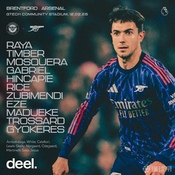 阿森纳客战布伦特福德:埃泽首发,苏比门迪、马杜埃凯出战