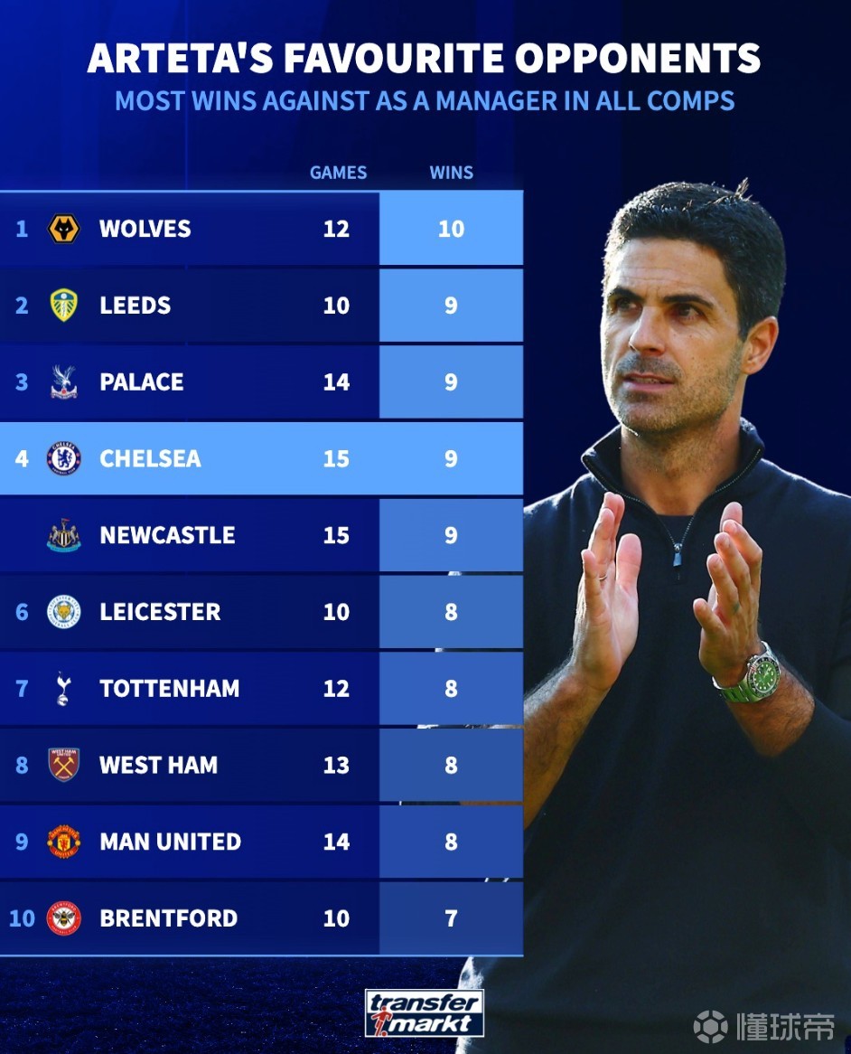 阿尔特塔教练生涯取胜场次最多的10个对手: