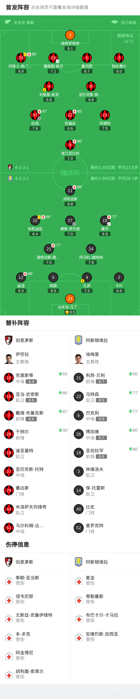 第22分钟,摩根-罗杰斯右路劲射破门,维拉1-0领先伯恩茅斯